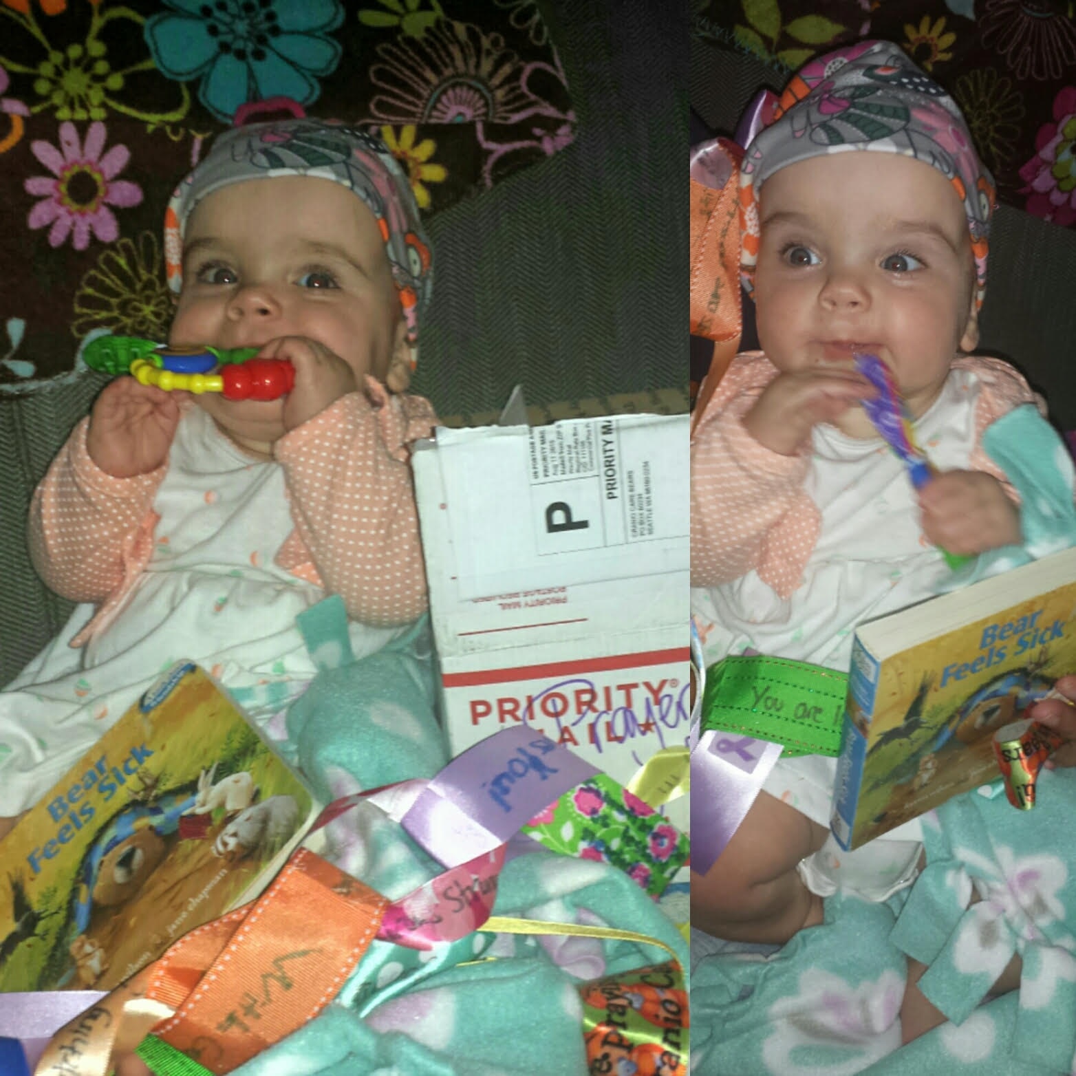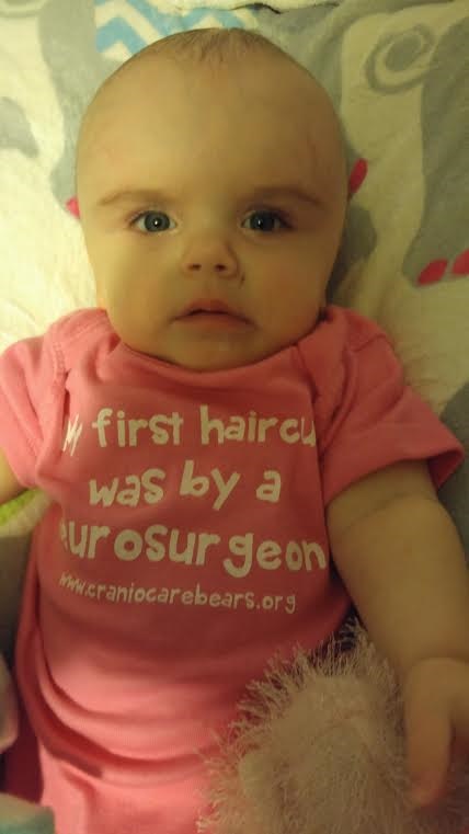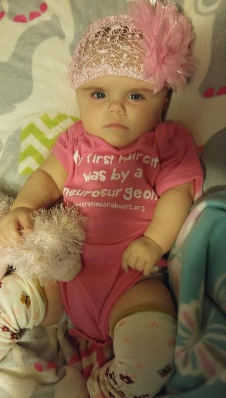 We received our Cranio Care Bears care package before the surgery (pictured below) which was so appreciated! What a great organization. She had her prayer chain and blanket with her at the hospital. The surgery was on a Wednesday (8/19/15). It lasted 8.5 hours and the waiting was so hard, but we got through it and when we got to see Aubrey afterwards my heart was so happy she was OK. After they took the bandages off, the swelling was unnerving! We stayed in the PICU for 2 days then moved to the regular floor and were released on Saturday. We left earlier than I expected, and although scared to go home with no nurses, it was nice to get to the comforts of home. The first week was rough, with no sleeping and crying a lot. Seeing her in pain is the hardest thing for a mother to witness. But she is slowly getting better. The swelling is going down some, and she has laughed and smiled which is wonderful. Thanks for letting me share my story. We love our first haircut by a neurosurgeon onesie! We are grateful for our baby’s healthy new head!!!