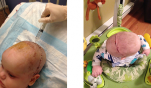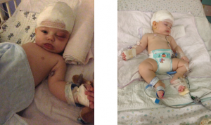 I brought Ben to the hospital on January 28th for admission and we settled into a nice private room. They had a cot there for me to sleep next to his crib. This was where we would spend the next week. We had to bring Ben down to the pre op room and we cut a piece of his hair for his baby book “first haircut” section. The surgery went very well and no transfusion was needed. He spent the night in PICU which is standard for these surgeries. He was on IV morphine and was in alot of pain. He wanted to nurse but kept throwing everything up. The nurses thought the morphine might be causing vomiting so they added the anti-nausea medication zofran to his IV but it did not help. The next day the swelling was starting but luckily it did not get that bad. Only one eye was swollen shut for about 12 hours, his neurosurgeon was even surprised. He was stable enough to be moved out of PICU to his room. The surgical doctor switched Ben to oral Tylenol and oral morphine on demand and the nausea continued. It wasn’t until 5 days after the surgery that he managed to keep his bottles down so they took the IV out at that point. On Day 7 the nurses removed half of the staples and sent us home. We had to get the remaining staples removed a week later. Since then we have had a perfectly happy baby boy. His hair grew back really quick and you can barely see his scar. The only difference is his hair grew back blond and it was black prior to the surgery. Ben will continue to be followed by his neurosurgeon and cranio team until he is 6 years old.