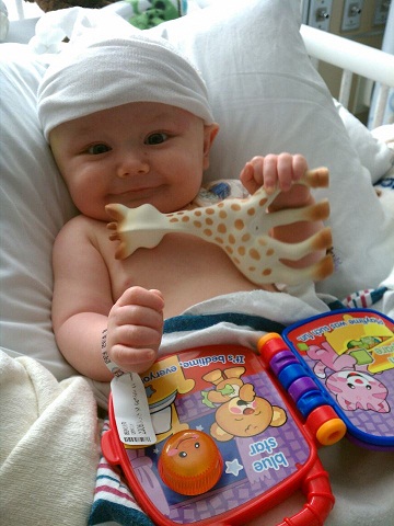 Brycen’s Cranio Journey… On August 5th 2011 my husband and I were blessed with the most precious baby….Brycen. He was perfect. I had had a very rough pregnancy. I had high blood pressure and was on bed rest through out my last 5 months of pregnancy. I was so happy to finally be holding my precious baby. Everything was great, all the doctors checked him out and sent us home with a perfect little boy. The only issues he had was acid reflux until his 2 month check up. We took baby Brycen to his doctor for his two month check up and shots. I was so scared of him getting shots I made my husband come home from work to go with us, and I was sure I was going to cry like a baby. Well within two minutes of the doctors exam he said words I will never forget. “Have you noticed these ridges on the sides of his head?” “Well his top soft spot is very hard to find…” And then he said it….”craniosynostosis.” In my mind I am going cranio what??? Noooo… my baby is perfect this doctor is crazy. He then sent us straight to the place next door to get x-rays of his head. I can remember sitting in the waiting room literally sweating as we waited to hear the results. And the whole time I was thinking there is nothing wrong with his head. He is PERFECT…this could not happen to us….could it? And within a few moments our doctor was on the phone telling me “it appears your son has sagittal cranio…” He said a lot more but that’s all I heard. Tears ran down my face and I cried so hard I barely heard anything he said. I heard the word surgery and I lost it. I ran out of the building with my husband holding Brycen so tight I am sure he could not breathe. NO it is not fair. NOT Brycen this is not real. God WHY are you doing this to us!?!?!? I was so angry at the world, God, the doctor, myself, just everything…it just did not seem real. But as time went on I soon realized it was real, and it happened to a lot of people. I found Cranio Care Bears, and found a lot of friends on the Facebook page for cranio awareness. I began my research on the whole topic and what this meant for us. Without my cranio friends I WOULD NOT have made it through all of this. All the kind words and prayers helped more than anyone would ever believe. Halloween, Thanksgiving, Christmas all seemed to fly by. January the 19th was our surgery date. I wanted the date to hurry up and come so we could be “on the other side” But at the same time I wanted time to stop so my sweet little man would never have to go through this surgery. Well time surely did not stop it seemed to fly by even faster, and before I knew it the day had came. After all my research, talking to other moms, and praying non-stop I had realized I was not being punished, it was not our fault, and God had a plan for us and Brycen. And with his guidance we were going to be just fine. I remember waking up the morning of surgery and just wanting to stay in bed and hold Brycen so close, and tight that NO one could take him from me. I had all my family there with me and my husband to support us which made things soooo much easier and of course all my Facebook cranio moms sent me positive encouraging messages alllll day long. We arrived at the hospital, had breakfast, and began to pray. Things were running behind that morning so they didn’t call us until 11:00. My husband and I went upstairs where the nurses and staff began to check us in and get Brycen ready. It seemed like everything was happening in slow motion. And everyone was talking like the people on Charlie Brown. “wwhha whhha whhaaaa” is all I heard. We talked to a lot of surgeons and doctors who all told us the same thing over and over. And finally the time had come to hand my son, my best friend, my heart and soul over to a complete stranger to operate on him. My heart stopped, my throat closed up, and I could not breathe. All I could do was hug him tell him how much we love him, and let him go. I cried and cried. Brycen was only 5 months old. He had no clue what was going on, why we were so upset, and most of all why we left him. We had AMAZING surgeons at UVA in Charlottesville VA. Dr John Jane JR, and Dr Kant Linn. All their nurses were so sweet to us and the doctors themselves called us throughout the surgery with updates. Which helped but the time we were away from him felt like forever. Finally around 4pm they called us up to the PICU and said we would be able to see him very soon. I remember walking down that long hallway wanting to run, scream “Brycen Mommy’s here!! I am here don’t worry anymore!!!” But of course I could not. Finally we had made it to his room. His little head was wrapped in purple wrap, and he already began to swell. He had IV’s and monitors from one end to the other. But it did not matter, he was OKAY!! My husband and I sat with him and talked to him as he slept. I was so happy and thankful it was over and we were on the other side! The first night was very hard in the hospital I wanted to sleep but would not dare leave his side. I sat all night holding his little hand and praying to God for a safe recovery. And God heard and answered that prayer. By Saturday, we were out of the picu and on the regular floor. Brycens doctor told us “he won’t open his eyes until at least Monday.” Well Brycen had other plans…it was not a few hours after the doctor had left that he opened his left eye. And by 5pm Saturday he had both eyes open and was taking wagon rides around the hospital. GOD IS GOOD! The weekend flew by and with everyday came progress for Brycen. He got well with great speed, and on Monday we were headed home. After being gone so long we were all glad to be home in our own beds! One thing the doctors don’t warn you about is the way your baby will sleep after surgery. Every night for 2 weeks Brycen woke up anywhere from 2-5 times a night screaming out like he was afraid of something. He fought going to sleep also like he was afraid. I think