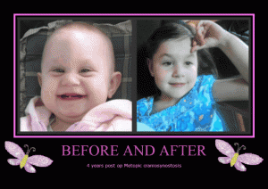 Fast forward, she is now almost 5, she is in kindergarten and is as happy as can be; she wears a helmet at school because we still could feel 2 large open spots where the bone has not grown back. She had her 3 year check up with Dr. Phillips in December 2010. He confirmed our suspicions. She didn’t heal properly, she had a CT done in January and to our surprise most of her skull from the coronal scar is still open, we were in shock. She will be having surgery this fall 2011, they are making titanium plates to put over the soft spots, she also had bone reabsorption over her left eye, they are making an implant out of PEEK material to help contour her forehead. She also had too much bone growth between her eyes so they will be shaving down the bone, they also are going to fix her scar, they are going to make it thin because it’s very thick right now. We were told this will be a 4-5 hour operation; she will be in the ICU for a night and on the regular floor for 2-4 days, she will have the drain tubes again. She is having this surgery on Oct 18 2011.