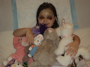 I could see that her left eye was already starting to turn black. She had a drain tube in and 3 IV lines. The nurse told me that she was loosing a lot of blood (more then normal) and that they were going to watch it. In the evening, she was more awake, but very cranky. They had her on morphine drip and Tylenol suppositories. She was still losing a lot of blood so they did a test on the blood from the drain tube. Her BP was very low, They told us that her HB level was at 80 which was low, they were going to test it again and if had gone down to 70 then she would be getting a transfusion. I was so upset because I was told that the chance of needing blood in this type of surgery was 0-2%. But thank the Lord, she didn’t end up needed it.