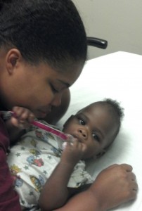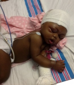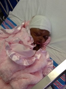 We were blessed with sweet Baby Londyn on December 28, 2011. Me and my husband were more than excited to see our baby girl. My son was also thrilled to be a big brother. She was perfect. She looked just like her daddy and was just the cutest most precious baby girl. Londyn saw her pediatrician before we were discharged and everything was fine. At her 2-week appointment, Londyn’s pediatrician noticed that the back of her head was pointed. She told me to just prop her head up when she was in her seat so her head wouldn’t roll to the side. That would eventually round out the back side of her head. Other than that, my baby Londyn was perfectly healthy. However, a few weeks later at her 2-month doctor’s visit, the doctor dropped a bomb on me that left me in a fog of confusion. She told me that her head was growing long and her soft spot appeared to be closing too fast. Then she said that we will keep an eye on this over the next couple of months and determine at her 4-month visit whether or not to refer her to a neurosurgeon. My mind went blank. I couldn’t put words together to even ask any questions. I went outside and called my mom and husband to tell them. I think that I was still in shock because all I told them was that her head was growing long. I then went home and settled my nerves a little and decided to do some research. I went to google and typed “baby’s soft spot closing too soon.” That’s when I first saw the word craniosynostosis. I found pictures of babies with the same head-shape as my sweet Londyn’s. I began to feel bad because how could I not see that something was wrong. After all, I am her mother. She is with me more than any other person in the world. How did I not know? So after doing some research I called my mom and husband back to give them the full story and tell them about craniosynostosis. Over the next couple of months, I continued to do research and prayed over my baby continuously. At Londyn’s 4-month visit, the doctor decided to make the referral to a neurologist in Macon. A couple of weeks later, me, my husband, and Londyn made the trip to Macon. He basically explained that Londyn appears to have sagittal craniosynostosis, but he would need to refer us to a neurosurgeon in Atlanta so he could do a CT Scan to make a definite diagnosis. A couple of weeks later, Londyn and I made the trip to Atlanta with my cousin. The neurosurgeon examined Londyn and told us that we would need the CT Scan but only 1 out of 10 babies that are sent to him actually have craniosynostosis. A few weeks later we went back to Atlanta and had the CT Scan done. That afternoon, we had an office visit with the neurosurgeon where he showed us the CT Scan and let us know that Londyn did indeed have sagittal craniosynostosis. He told us that it is very good that the pediatrician caught it very early. He explained that surgery would be needed to correct it and he referred us to a plastic surgeon who would also perform the surgery with the neurosurgeon. We saw him a few weeks later. He took pictures and told us that he would schedule the surgery as soon as they could. Londyn was scheduled to have cranial vault reconstruction on September 7, 2012. My husband and I made the trip to Atlanta with my mom the night before. My father-in-law and brother-in-law and an elder from our church also came to be there for Londyn. While we were waiting for them to take her into surgery we were all kissing on her and loving on her. She drifted off to sleep right before they came to take her away. We prayed over her and let her go.