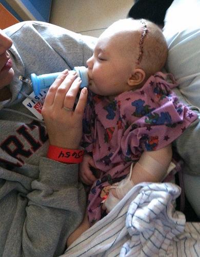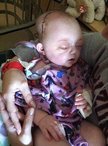 On November 12, 2012, Veteran’s Day Holiday, Quinn had her surgery. The surgery was a success. It lasted approximately 3 hours. Next to our daughter and husband making the decision to have the surgery, was seeing our grand daughter after the surgery. To be quite honest it was very hard to see Quinn after the surgery with the swelling, and the next 3 days were hard until the swelling came down. Her eyes were like two giant water blisters which she was finally able to open her left eye on Thursday and the right on Friday, so they released her that day. By the end of the second week all the swelling was gone. We only had to give pain medication 3 times after she came home. We gave her Children’s Tylenol every 4 to 5 hours for discomfort and then later maybe every 8 hours. Quinn is showing no signs of aggravation from the staples. She does not reach up to touch the area. She got the staples (44 of them) removed on December 4th. She does everything she did before the surgery.