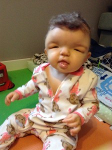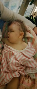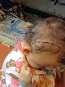 My daughter Sofia was born with a condition called cranio facial nasal dysplasia syndrome. At 10 months old she underwent skull surgery at the BC Children’s hospital here in Canada to open both side sutures that had fused prematurely. She also had her forehead bone brought forward to give her head a more normal natural shape. She had her surgery December 22nd 2015 early in the morning. The surgery itself lasted four hours with no complications. On the 26th of December we were discharged from the hospital and able to come home. It is now 5 days later and Sofia is slowly becoming the giggly baby she once was. The swelling from the procedure has come down quite a bit and she is now able to see out of both eyes fairly well.